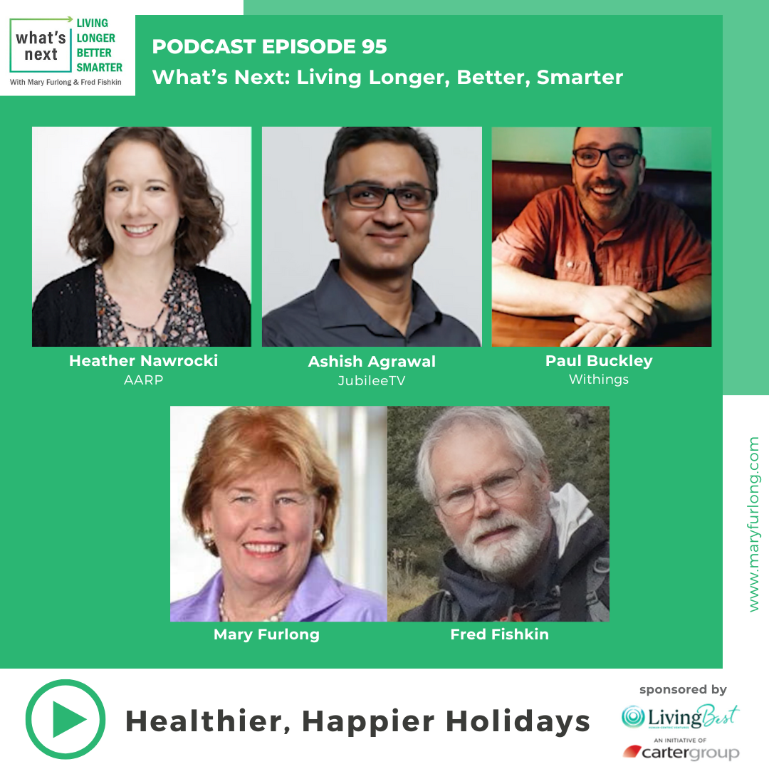 Looking for gift ideas for the holidays for parents or grandparents? Healthier, Happier Holidays is the theme on episode 95 of What’s Next Living Longer Better Smarter. Mary and Fred welcome JubileeTV CEO Ashish Agrawal, from Withings, Paul Buckley and from AARP, VP of Fun and Fulfillment Heather Nawrocki. Making the holidays meaningful and merry!